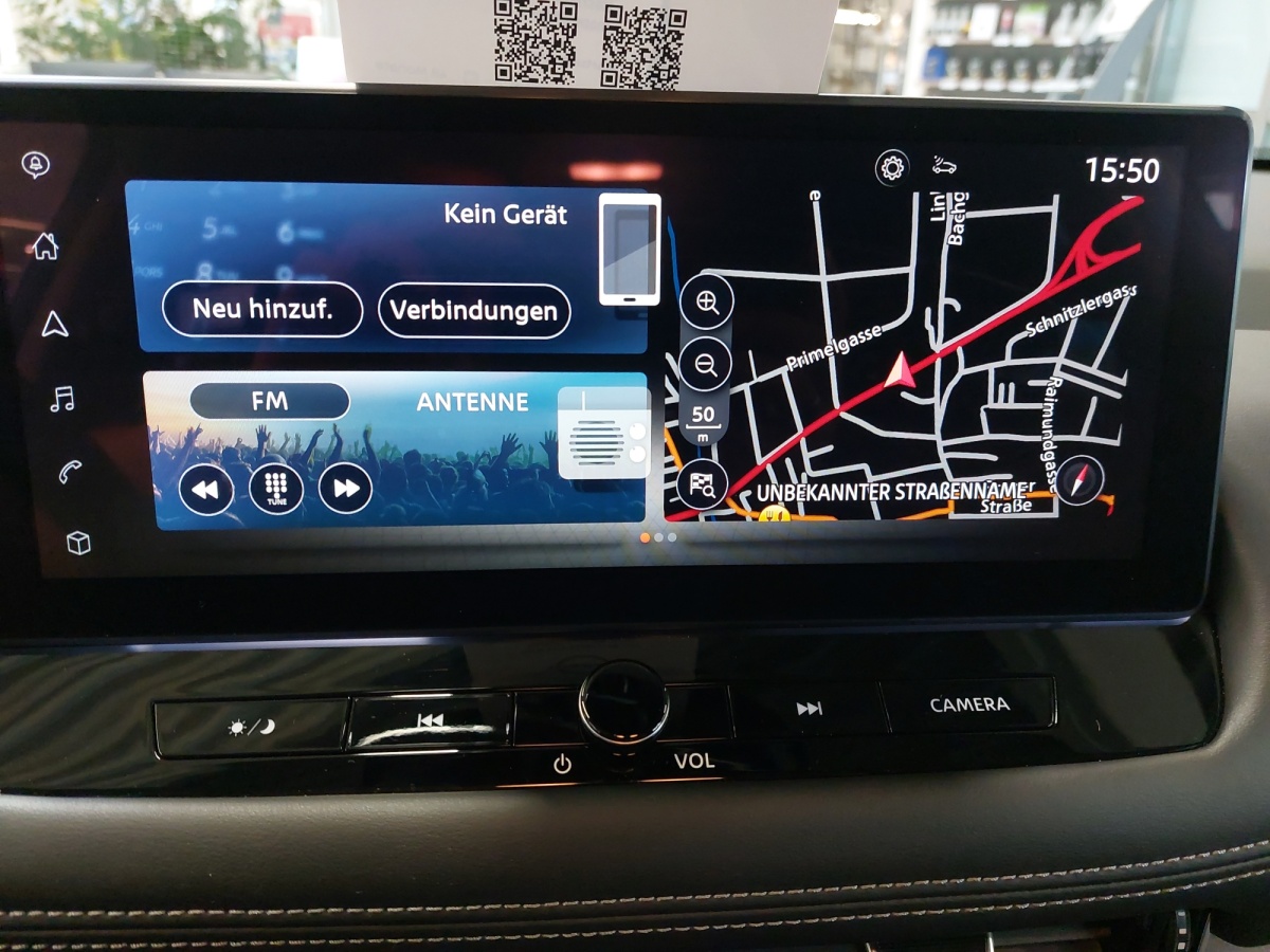 * NissanConnect mit 12,3″ Touchscreen, Navigation inkl. TomTom® Services, Premium Verkehrsinformation, 3 Jahre kostenlose Kartenaktualisierung, FM/DAB+ Tuner, Bluetooth Freisprecheinrichtung und Audiostreaming, Spracherkennung, kabelloses Android Auto & Apple CarPlay, NissanConnect Services und 6 Lautsprechern